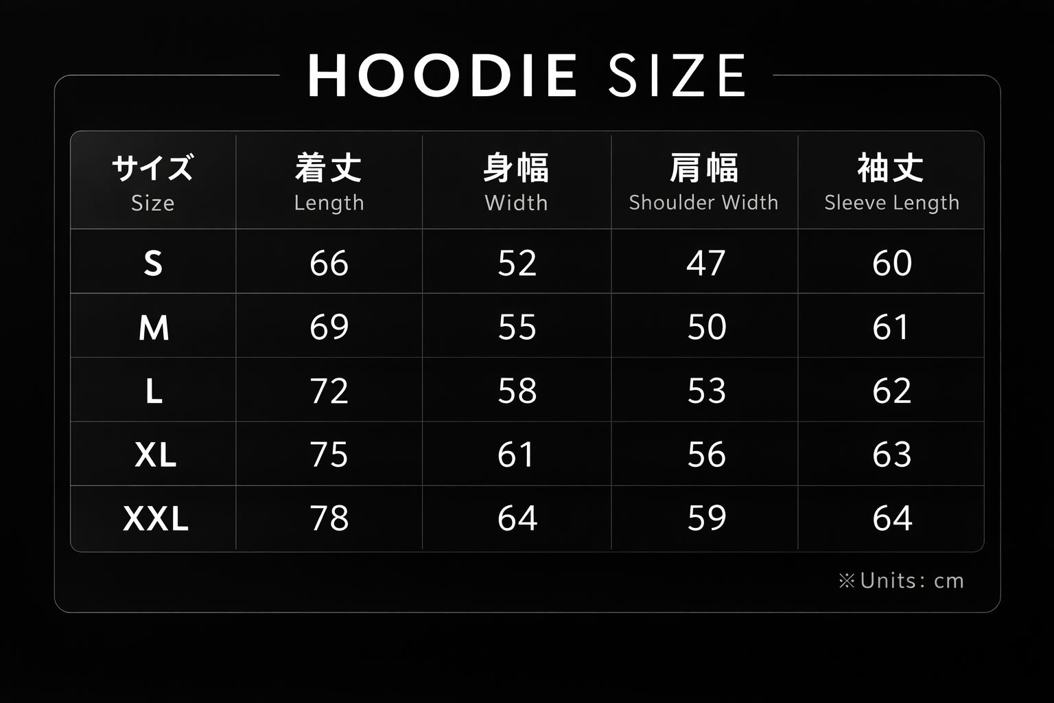 【Hoodieサイズ】 単位 cm